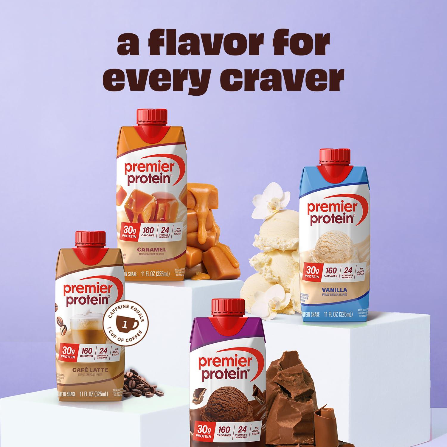 Each Premier Protein Shake contains 30g of protein, complete with all the essential amino acids, 1g of sugar, 3–5g of carbs (depending on flavor), 160 calories, 24 vitamins and minerals, and is also low in fat. We use a blend of milk protein concentrate and calcium caseinate to help support your fitness goals. Enjoy a shake as a healthy snack, a breakfast on the go, or as post or pre-workout fuel. They are delicious as is but also highly customizable. Blend with your favorite fruits and vegetables in a smoothie, pour over cereal or oatmeal, or use as a base for proffee (protein coffee) or protein ice cream. Available in 12 core flavors: Bananas & Cream, Cake Batter Delight, Cafe Latte, Caramel, Chocolate, Chocolate Peanut Butter, Cinnamon Roll, Cookie Dough, Cookies & Cream, Peaches & Cream, Strawberries & Cream, and Vanilla. (Seasonal flavors also available for a limited time.)