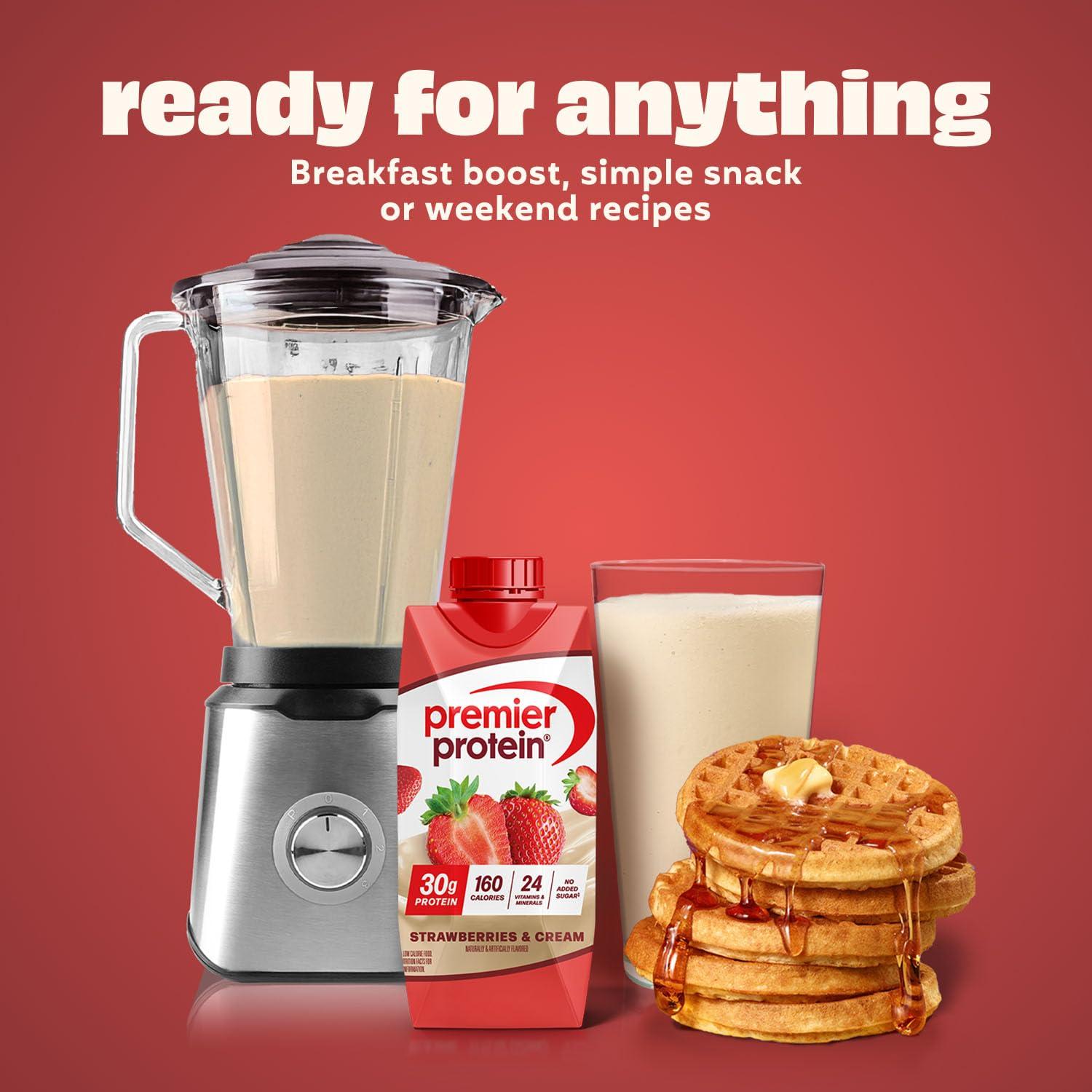 Each Premier Protein Shake contains 30g of protein, complete with all the essential amino acids, 1g of sugar, 3–5g of carbs (depending on flavor), 160 calories, 24 vitamins and minerals, and is also low in fat. We use a blend of milk protein concentrate and calcium caseinate to help support your fitness goals. Enjoy a shake as a healthy snack, a breakfast on the go, or as post or pre-workout fuel. They are delicious as is but also highly customizable. Blend with your favorite fruits and vegetables in a smoothie, pour over cereal or oatmeal, or use as a base for proffee (protein coffee) or protein ice cream. Available in 12 core flavors: Bananas & Cream, Cake Batter Delight, Cafe Latte, Caramel, Chocolate, Chocolate Peanut Butter, Cinnamon Roll, Cookie Dough, Cookies & Cream, Peaches & Cream, Strawberries & Cream, and Vanilla. (Seasonal flavors also available for a limited time.)