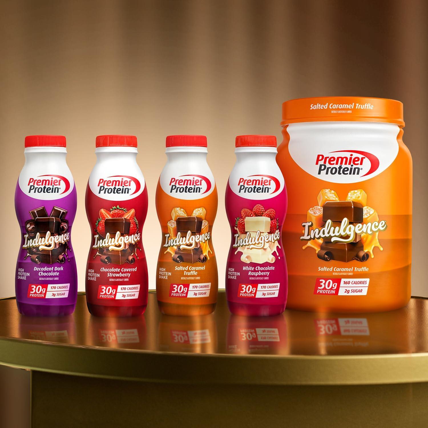 Premier Protein Indulgence Shakes are our most decadent dessert-inspired flavors yet. Enjoy a shake as an on-the-go breakfast, afternoon snack, satisfying lunch replacement, or a healthy late-night dessert to curb your cravings. Packed in 11.5oz bottles, each protein shake contains 30g of protein, complete with all essential amino acids, 3g of sugar, 6-7 carbs (depending on flavor), 170 calories, 24 vitamins & minerals, and is low fat, keto friendly and gluten free. We use a blend of milk protein and casein to help fuel your muscles and support your health goals. Available in 4 flavors: Chocolate Covered Strawberry, Decadent Dark Chocolate, Salted Caramel Truffle, and White Chocolate Raspberry.
